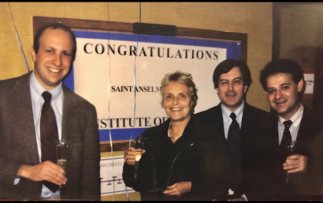 1999: Dante Scala, Barbara Baudot, Bill Gould and Paul Manuel celebrate the first $2 million grant for the NHIOP — then called the Saint Anselm College Institute of Politics